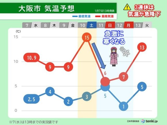 近畿地方では、この先は断続的に寒気が流れ込むでしょう。特に11日(日)〜12日(月)成人の日はこの冬に入って最も強い寒気が流れ込み、震えるような寒さになる見込みです。日本海側や山沿いを中心に雪や雨が降るため、積雪や路面の凍結に注意してください。