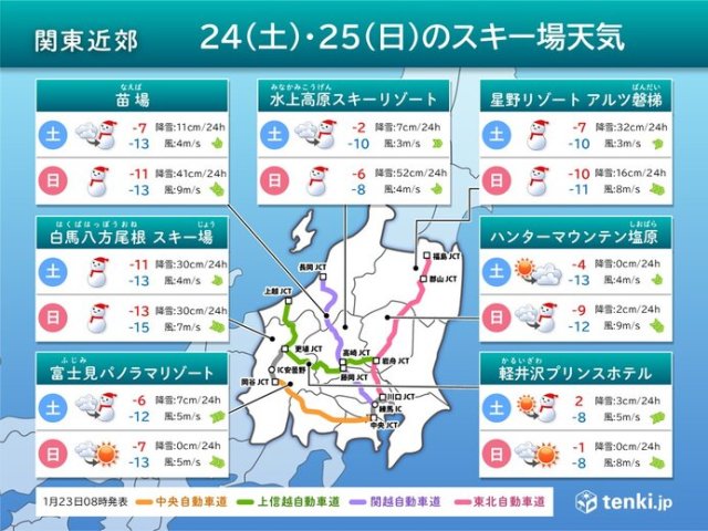 栃木県や長野県中部のスキー場でも雪の降る時間がありますが、明後日25日(日)を中心に晴れ間があるでしょう。ただ、こちらも冷たい風が吹きます。万全の寒さ対策で楽しみましょう。