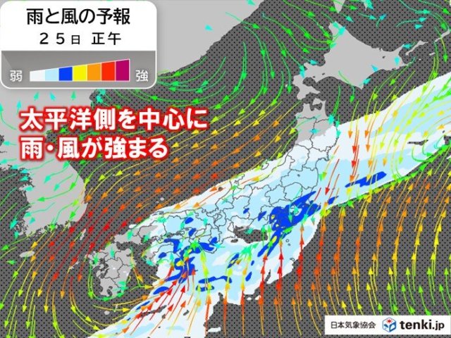 今日25日(水)は、九州から東北にかけて広く雨が降り、関東など太平洋側では雷を伴い激しく降る所があるでしょう。日中の気温は昨日より低くなる所が多く、寒さが戻りそうです。