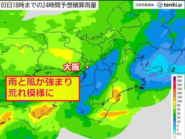 3日(火)は、低気圧が西日本の南岸付近を進む見込みです。近畿は夕方にかけて、広く本降りの雨となるでしょう。昼間は低気圧周辺の発達した雨雲が流れ込み、京阪神でも雨量が多くなりそうです。紀伊半島南東側では、暖かく湿った空気が流れ込んで大気の状態が不安定になるため、朝から昼すぎにかけて激しい雨や雷雨となる所があるでしょう。強い風が吹きつけ、太平洋は次第にしける見込みです。強風や高波にもご注意ください。