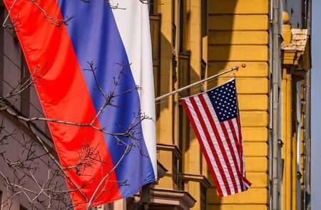 12日、モスクワの米大使館に掲げられた米ロ両国旗(EPA時事) 【ワシントン時事】米財務省は12日、ロシア産原油の購入を一時的に認めると発表した。米イスラエルとイランの軍事衝突で原油相場が急騰する中、対ロ制裁を緩和することで供給量を増やし、価格を抑制するのが狙い。ウクライナ侵攻の戦費として利用されるため米政権は制裁を強めていたが、供給混乱を受け、方針を転換した。