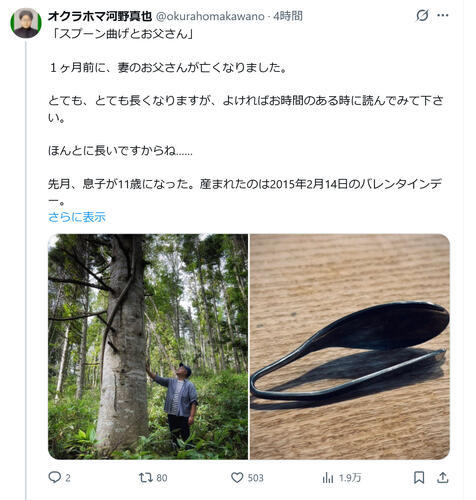 看護師への感謝をつづるとともに、医療ミスを疑い病院側とやりとりした経緯や、「副作用被害救済制度」と「高額医療費制度」も活用して家族の負担を軽減したことなども記し、「お父さんの心臓がとまったあの日、誰かに『それは医療ミスだよ!』と言ってもらって、誰かのせいにできたら、もっと楽だったんだろうか。ただただ、受け入れるしかなかった。自発呼吸で、命の選択をするタイミングなんて一度もなく、11年を病院で過ごした。『副作用被害救済制度』が無く、すべて自費だったらどれだけ大変だったんだろう。『高額療養費制度』があるから大丈夫だったか。それも無かったら……。たくさんの人と、今ある制度に助けられて、お父さんと僕たち家族は11年を過ごしてきました。心から感謝しています」とつづった。