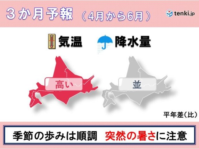 今日(24日)、札幌管区気象台から最新の3か月予報が発表されました。4月から6月にかけての道内は、気温が平年より高く、降水量は各地ともほぼ平年並みの見込みです。これから北海道は本格的な春を迎えますが、その後も6月にかけて季節の歩みは順調に進みそうです。しかし、春先は花粉や黄砂、そして5月以降は厳しい暑さとなる日も出てくるため、暑さ対策も早めに行うようにしましょう。