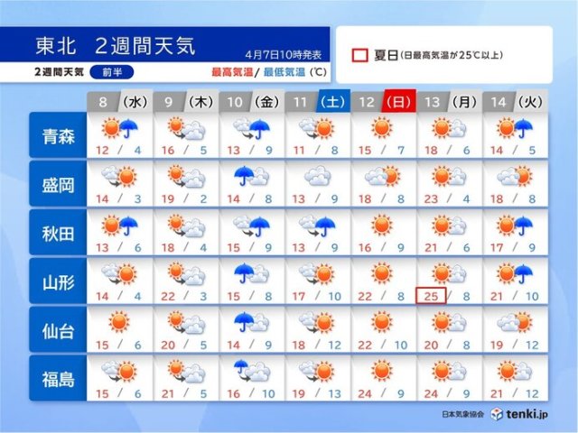 この先の東北地方は、天気が周期的に変わるでしょう。12日(日)など晴れる日はお花見日和となりそうです。気温は平年を上回る日が多く、13日(月)は山形で夏日となる見込みです。急な暑さへの対策も必要になりそうです。