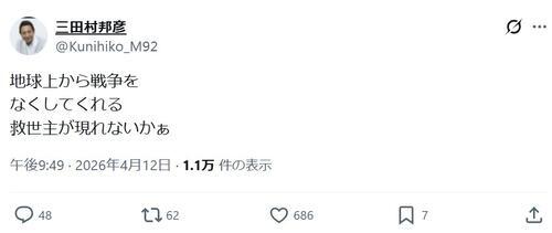 俳優三田村邦彦(72)が13日までにXを更新。米国、イスラエルによるイラン攻撃の停戦交渉が不調に終わった後の12日午後9時49分のポストで「地球上から戦争をなくしてくれる救世主が現れないかぁ」とつづっている。