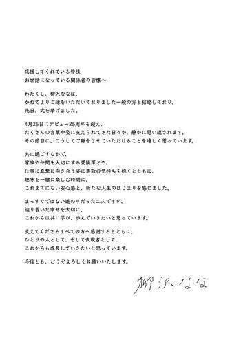 さらに「まっすぐではない道のりだった二人ですが、辿り着いた幸せを大切に、これからは共に学び、歩んていきたいと思っています。支えてくださるすべての方へ感謝するとともに、ひとりの人として、そして表現者として、これからも成長していきたいと思っています。今後とも、どうぞよろしくお願いいたします。柳沢なな」と記した。