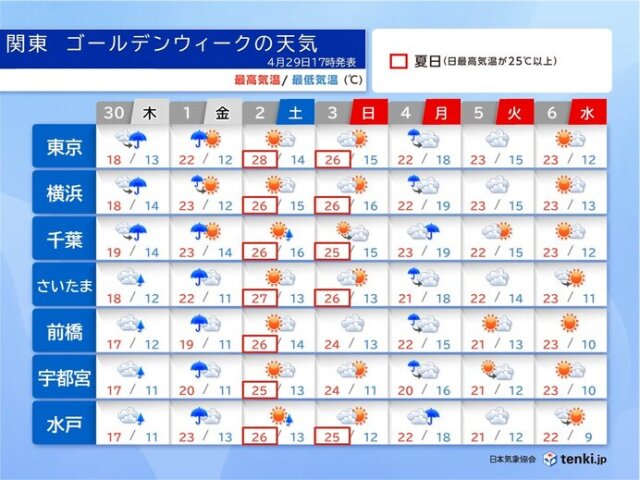 ´ØÅì¤ÏÌÀÆü30Æü(ÌÚ)¤ÎÌ뤫¤é¼¡Âè¤Ë±«¤¬¹ß¤ê¤À¤·¡¢5·î1Æü(¶â)¤Ï±è´ßÉô¤ÇÂ籫¤Ë¤Ê¤ë¤ª¤½¤ì¤¬¤¢¤ê¤Þ¤¹¡£¤½¤Î¸å¤Ï°ìž¤·¤Æ½ë¤¯¤Ê¤ê¡¢¥´¡¼¥ë¥Ç¥ó¥¦¥£¡¼¥¯¸åȾ¤ÏÇ®Ãæ¾É¤ËÃí°Õ¤¬É¬ÍפǤ¹¡£