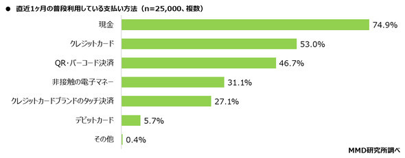 直近1カ月で普段利用している支払い方法(複数回答)は、「現金」が74.9%、「クレジットカード」が53.0%、「QR・バーコード決済」が46.7%となった。