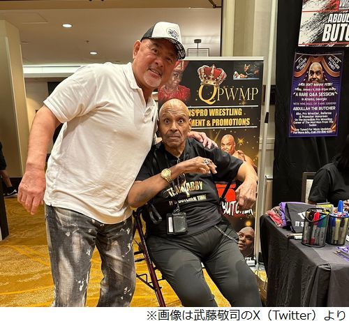 海外でも大人気の武藤は、現在、サイン会などのため渡米中。Xではアメリカでの様子などを随時投稿しているが、3日に披露したのは、“黒い呪術師”のニックネームで、主に1970年代から1980年代に日本でも活躍した、巨漢レスラーのブッチャーとのツーショットだった。
