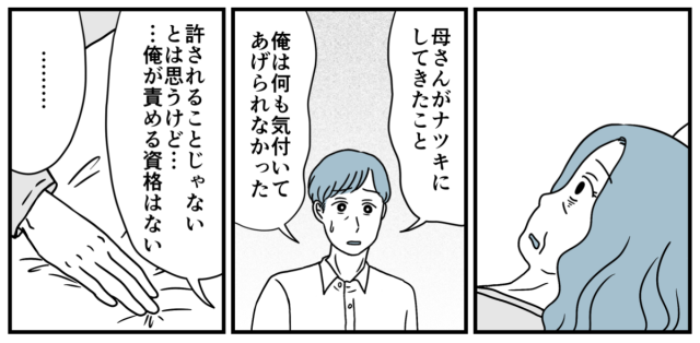 面会に行ってすっかり弱々しくなった義母の姿を見るたび、ナツキさんの話が蘇ります。ナツキさんに届くことはない謝罪を、義母はずっとつぶやき続けながら日々を過ごしていくのでしょう。これは当然の報いなのかもしれません。