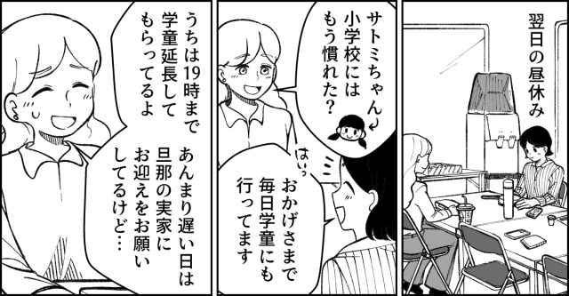 職場で先輩のミナミさんと一緒にお昼を食べていると、子どもの学童やお迎えの話になりました。ミナミさんの娘さんは小学2年生で、うちと同じく近所の義実家に頼ることがあると言います。そこで私は思い切って相談してみました。