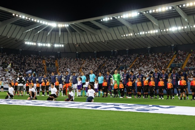パリ・サンジェルマン(PSG)とトッテナムが激突したスーパーカップでは、試合前に議論を呼ぶ演出がピッチ上で行われた。大会ロゴをあしらったバナーがセンターサークル付近に広げられるなか、その近くに「STOP KILLING CHILDREN(子どもの殺害を止めろ)」というメッセージが描かれたバナーが掲載された。スタンドで政治的なメッセージを込めたバナーが掲げられるケースはこれまでもあったが、今回は欧州サッカー連盟(UEFA)の式典の一部で掲載される異例の事態となった。
