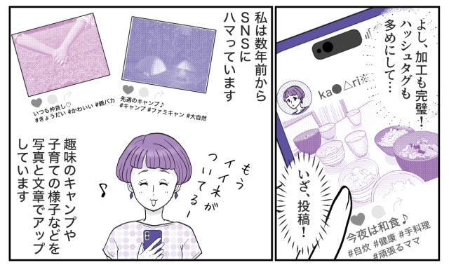 私はSNSを見るのはもちろん、画像や動画を投稿するのが趣味になっています。子育てや日常の喜びをSNSで記録し、「いいね」される日々を楽しんでいました。そんなある日ママ友のサキちゃんから、うちと同じくキャンプが趣味だというマリナちゃんを紹介されました。