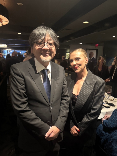 カナダ・トロントで開催された「ソニー・ピクチャーズ・クラシックス TIFF セレブレーション・ディナー」でスカーレット・ヨハンソンと記念撮影に成功した細田守監督 イタリアで開催された「第82回ベネチア国際映画祭」に続き、カナダ「第50回トロント国際映画祭」に参加している細田守監督。現地時間9月6日、映画『果てしなきスカーレット』の公式上映に先立ち、本作の世界配給(日本を除く)を担うソニー・ピクチャーズ主催のディナーパーティーに出席し、多数のハリウッドスターや映画関係者と交流した。