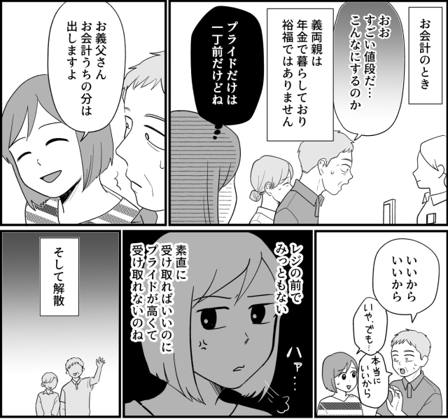 義両親との食事会の帰りの車中で、私は旦那に今日のイライラをぶつけました。「……あのさぁこういう集まりムリさせるだけだからやめない? 私、ケチられてまでご飯行きたくないんだけど。ここでムダなお金を使って恩を着せられて、老後の面倒を頼られてもね……」旦那は黙って私の話を聞いています。