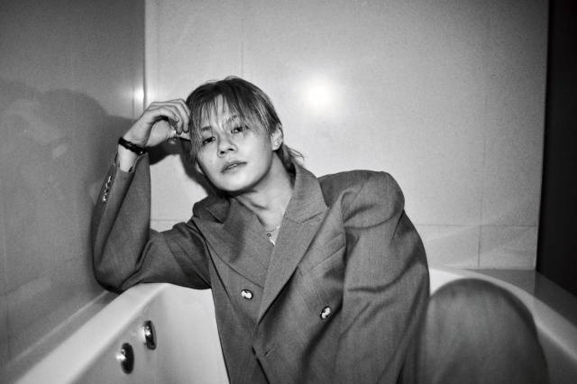 2枚目は、カイの大人の魅力が引き立つジャケットスタイルの衣装で、色気が匂い立つようなモノクロのカット。ホテルのバスタブで撮影され、カイ自身のスタイリングで表現されたファッショナブルな魅力と、艶っぽさあふれるたたずまいでこちらを見つめてくるような表情に思わずドキッとさせられる。