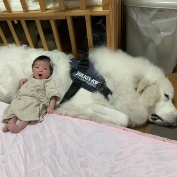床に横たわって眠る大型犬のグレートピレニーズのシュシュちゃんを、ベッドかのようにその上で横になる生後1ヵ月の娘さん。そんな2人の姿に、「シン・もののけ姫?」「守り神のよう」「夢のベッド…」「最高の癒しタイム」などと、13万いいねを超える反響があった。