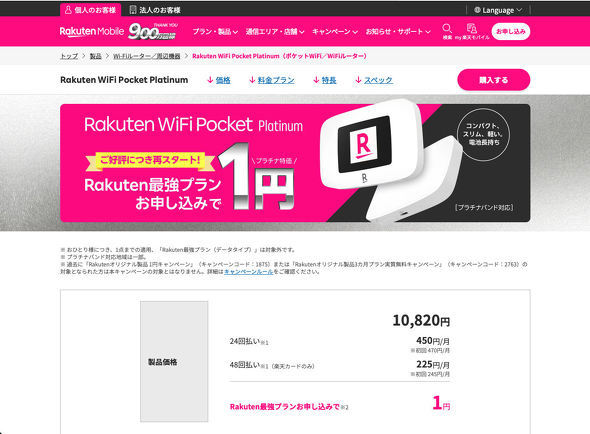 このように個人的には利用していないのだが、モバイルWi-Fiルーターは根強い人気があり、MNOやMVNOで取り扱いがある。中でも楽天モバイルは2025年9月末現在、「Rakuten最強プラン」(データタイプは除く)を契約すると、本体価格1万820円のところ1万819円割引となり、4G対応の「Rakuten WiFi Pocket Platinum」を1円で購入できる。