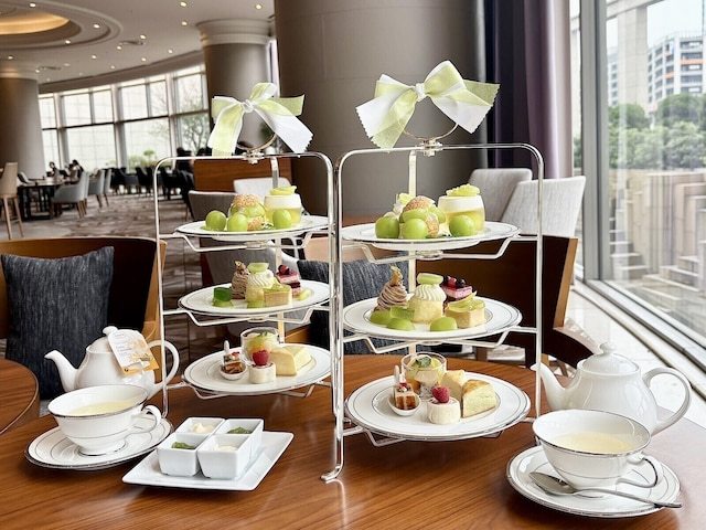 広々とした高級感あふれる店内で、24階の大きな窓から見る景色を眺めながら、アフタヌーンティーを楽しむ時間はまさに至福のひととき。シャインマスカットのスイーツや、セイボリーを心ゆくまで楽しみたい方にぴったりのアフタヌーンティーです。