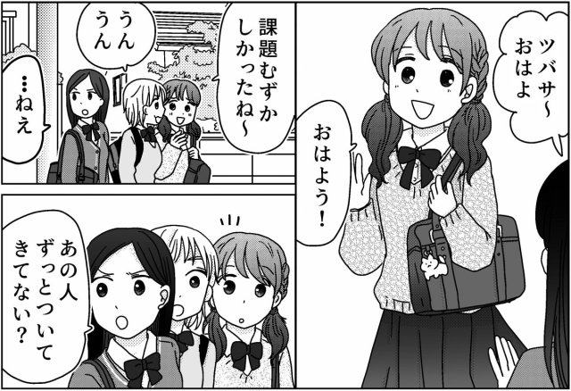 友だちとの登校中、誰かにあとをつけられていることに気づきました。よく見ると、最近LINEを送ってくる伯父さんでした。気持ち悪くて怖くて、友だちと学校に駆け込みました。