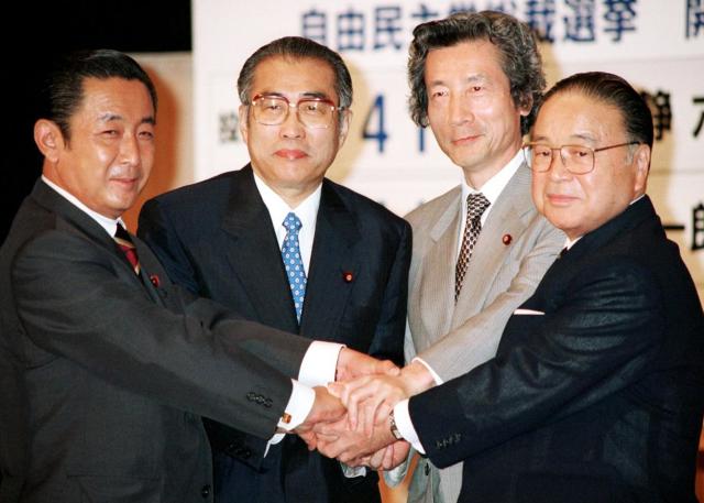 1998年の総裁選で握手を交わす(写真左から)前総裁の橋本龍太郎氏、新総裁に選出された小渕恵三氏、小泉純一郎氏と梶山静六氏。常に強敵に挑み続けた小泉一族だが果たして―― 写真/産経新聞社―[言論ストロングスタイル]―