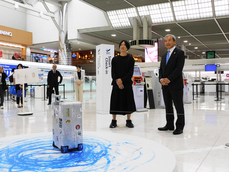 成田空港会社のアートコンペティションで大賞を受賞した作品(左手前)と撮影に応じる作者(中)ら=1日、成田空港 成田空港(千葉県成田市)の第2ターミナル出発ロビーで、若手アーティストの芸術作品が展示されている。空港を運営する成田国際空港会社が今年始めたアートコンペティション「NARITA ART RUNWAY」で選出された優秀作で、田村明比古相談役は「アートを通じて空港の体験価値を向上させようという取り組み。若手の世界進出を後押ししたい」と話している。