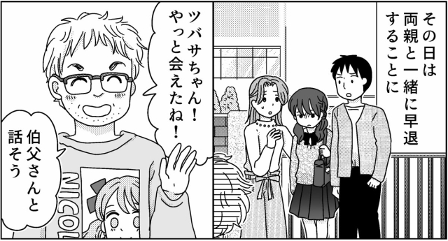 両親が先生と話をした結果、この日は両親と一緒に早退することになりました。両親と3人で学校を出ると、そこには伯父が立っていました。最初は怖さが勝っていたものの、ニヤニヤしながらしゃべる伯父さんを見ていたらだんだんと腹が立ってきました。