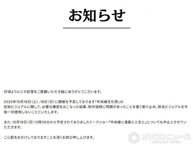 【写真】騒動の発端となった『中央線文化祭2025』の告知ビジュアル ルミネ荻窪は「お知らせ」と題した文書の中で、「2025年10月18日(土)、19日(日)に開催を予定しております『中央線文化祭』の告知ビジュアルに関して、必要な確認をおこなった結果、制作過程に問題があったことを重く受け止め、該当ビジュアルを今後一切使用しないことといたします」と発表。続けて「また、10月19日(日)12時30分から予定されておりましたトークショー『中央線と漫画と人生と』についても中止とさせていただきます」と伝えた。