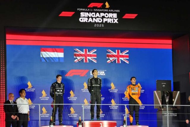 2025年F1第18戦シンガポールGP表彰式 優勝ジョージ・ラッセル(メルセデス)、2位マックス・フェルスタッペン(レッドブル)、3位ランド・ノリス(マクラーレン) 2025年F1第18戦シンガポールGPの決勝レースで優勝〜5位のドライバーたちが日曜日を振り返った。優勝〜5位のドライバーはジョージ・ラッセル(メルセデス)、マックス・フェルスタッペン(レッドブル)、ランド・ノリス(マクラーレン)、オスカー・ピアストリ(マクラーレン)、アンドレア・キミ・アントネッリ(メルセデス)だ。