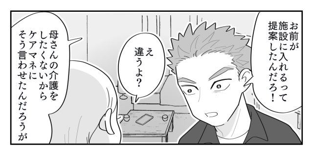 仕事から帰ってきた夫にケアマネジャーさんとの話を伝えると、夫は「施設」という言葉に怒りをあらわにしました。けれど義母の施設入居を検討するのは、義父とも話し合って決めたこと。夫は気に食わないのかもしれないけれど、他にどんな方法があるというのでしょうか。