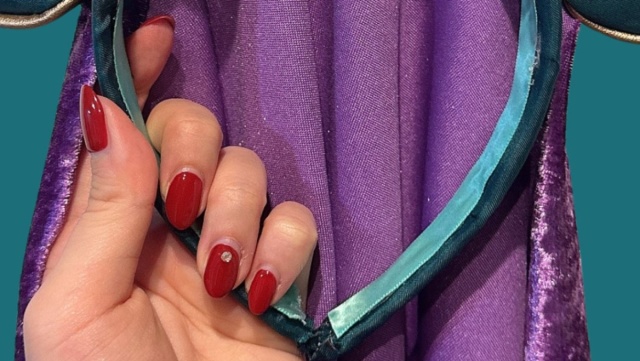 ミオチさんは2024年の9月ごろから構想をねり始め、10月には布などの材料を用意。試行錯誤したのち、12月についに完成しました! 土台はダイソーのカチューシャを使用し、耳部分には自作の半立体刺しゅうが施されています。中央には王冠の飾り。エルサの衣装と同じく、紫と黒、そして深みあるグリーンを基調とし、後ろにはベルベット状のマントのようなベールがあり、とてもゴージャスです!