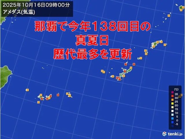今日16日(木)は、沖縄では晴れて朝から気温が上がっています。午前9時前に那覇市で30℃を超えて、今年138回目の真夏日(最高気温30℃以上)となりました。統計開始以来、真夏日の日数が最も多くなりました。