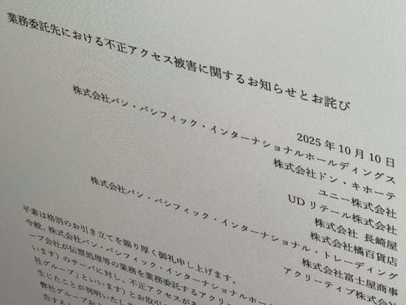 パン・パシフィック・インターナショナルホールディングス(PPIH)は10月10日、伝票処理などを委託していたアクリーティブ(千代田区)が不正アクセスを受け、グループ企業の顧客情報が漏えいした可能性があると発表した。