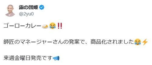 露の団姫のXから上方落語の露の団姫(つゆの・まるこ=39)が17日、X(旧ツイッター)を更新。師匠・露の團四郎(70)の3代目露の五郎襲名を記念して「ゴーローカレー」が発売されることをPRした。
