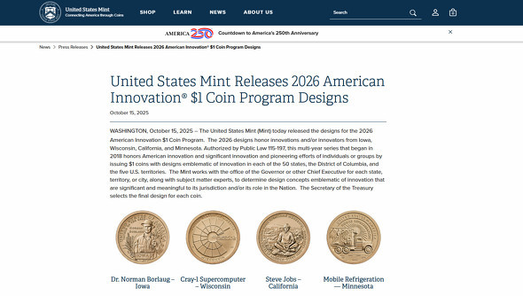 米国造幣局は10月15日(現地時間)、記念硬貨シリーズ「アメリカン・イノベーション1ドルコイン」の2026年の新デザイン4種を公開した。このうちカリフォルニア州を代表する技術革新をたたえるデザインとして、若き日のスティーブ・ジョブズ氏の肖像が採用された。