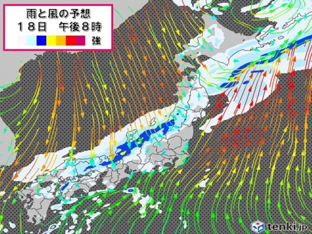 今日18日(土)は、前線と低気圧が日本列島を通過する見込みです。西日本から北日本の広い範囲で雨が降り、午後は局地的に激しい雨や雷雨になるでしょう。
