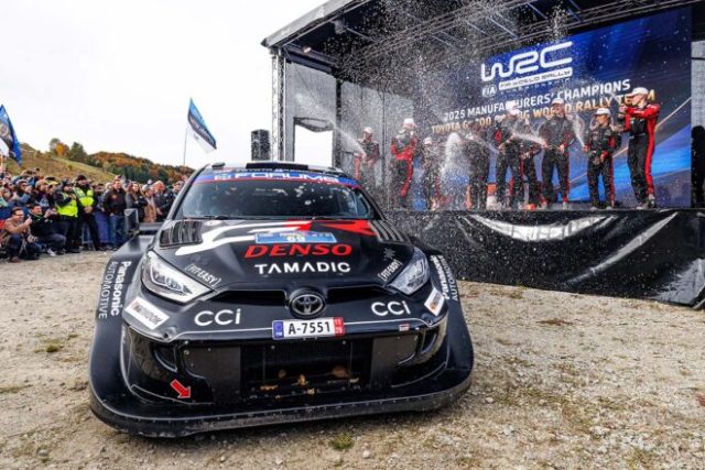 マニュファクチャラーズタイトル獲得のシャンパンファイトを楽しむTOYOTA GAZOO Racing WRTのメンバーとトヨタGRヤリス・ラリー1 10月19日(日)、2025WRC世界ラリー選手権の第12戦『セントラル・ヨーロピアン・ラリー(CER)』の最終日デイ4がドイツとオーストリアを舞台に行われ、TOYOTA GAZOO Racing WRT(TGR-WRT)のカッレ・ロバンペラ(トヨタGRヤリス・ラリー1)が総合優勝を飾った。これでシーズン11勝目をあげたTOYOTA GAZOO Racing WRTは、2戦を残してマニュファクチャラーズ選手権のタイトル獲得を決めた。