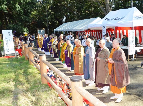 古くなって飾らなくなったり、壊れてしまったりした「捨てるに忍びない」人形を、僧侶の読経の下、参加者が焼香し、冥福を祈り供養するイベント。毎年11月3日に開催され、今年で61回目を迎える。