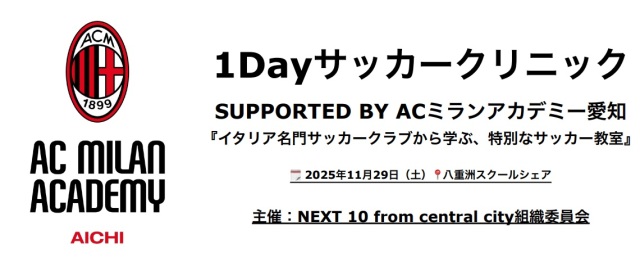 世界トップクラスの指導の下、サッカー体験ができる。イタリアのサッカーリーグ「セリエA」で、19回の優勝を誇る名門ACミランのアカデミーによる「1Dayサッカー教室」が、11月29日に東京都中央区で小学生以下を対象に開催される。会場は、東京駅から徒歩5分、東京八重洲ミッドタウン内にある「八重洲スクールシェア」で、まさに日本の中心で行われる。