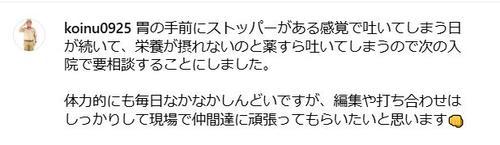 マサ越前は現在、胃がんの治療で抗がん剤の投与を続けている。今月17日に自身のSNSで3度目の抗がん剤投与を明かしていた。寝ている写真を公開し「胃の手前にストッパーがある感覚で吐いてしまう日が続いて、栄養が摂れないのと薬すら吐いてしまうので次の入院で要相談することにしました」と記述。