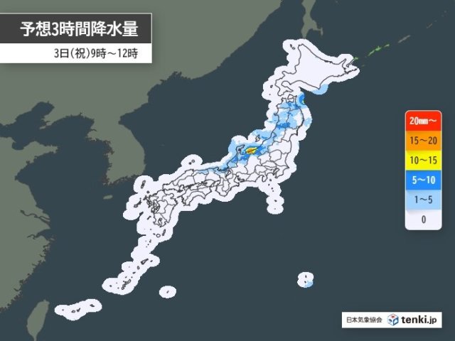明日3日(月:文化の日)は、日本海から近づく低気圧と上空の寒気の影響で大気の非常に不安定な状態が続くでしょう。中国地方や近畿は午前を中心に、北陸や東北では夕方にかけて雨が降りそうです。雷を伴い激しい雨が降る所もあるでしょう。これまでの雨で、地盤が緩んでいる所もあります。土砂災害や低い土地の浸水、河川の増水にも注意が必要です。また、落雷やひょう、竜巻などの激しい突風にもご注意ください。