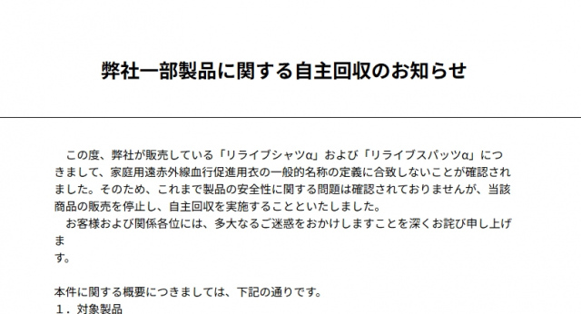 「弊社内において、『家庭用遠赤外線血行促進用衣の一般的名称』の定義に対する認識が不足しており、経緯に記載しました 25年8月の事務連絡をもって輻射範囲の定義に対する認識をあらためるに至りました。これを受け弊社は、当該商品の新規出荷および販売を停止するとともに、既にお買い上げいただいた商品の自主回収の実施を決定いたしました」とし、「なお、製品自体の安全性への影響はないため、製品の使用等が健康被害の原因となる恐れは考えられません。また、現在までに当該事象に起因する健康被害は報告されておりません」とした。
