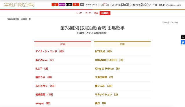 ¡¡12·î31Æü¤ÎÂç³¢Æü¤ËÊüÁ÷ͽÄê¤Î¡ÖÂè76²óNHK¹ÈÇò²Î¹çÀï¡×¤Î½Ð¾ì²Î¼ê¤¬È¯É½¤µ¤ì¤¿¡£