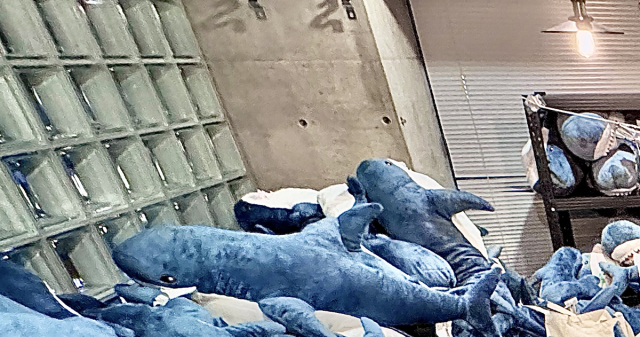 いったい何があったのかと思って見てみると……部屋の大部分を埋め尽くすほど大量のサメのぬいぐるみが部屋にあふれています! 1匹1匹はかわいいサメのぬいぐるみですが、これだけ大量にあるとさすがに圧がすごいです。でも、サメ好きからしたら夢のような空間かも!?