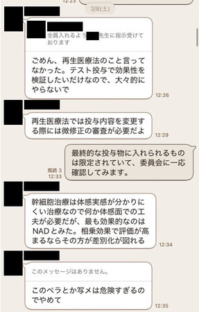 東京都千代田区の再生医療医院のグループLINEのやりとり(一部加工してあります)(同院関係者提供) 病気やけがで機能不全になった組織や臓器を元に戻す「再生医療」などが専門の東京都千代田区の医院で、自己脂肪由来の幹細胞を投与する際、提供計画から逸脱して試薬を混ぜていたことが19日、関係者への取材で分かった。厚生労働省は重大な不適合事案として事実関係を確認している。