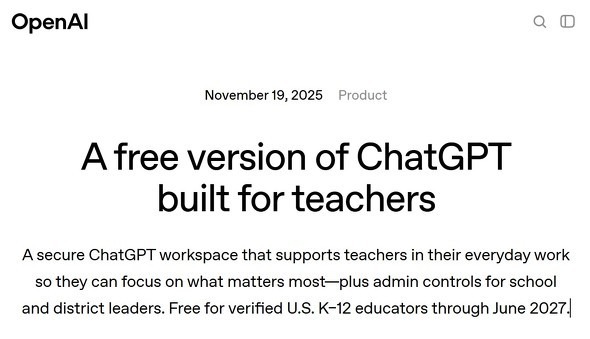 ¡¡ÊÆOpenAI¤Ï11·î19Æü¡Ê¸½ÃÏ»þ´Ö¡Ë¡¢¶µ°é¼Ô¸þ¤±¤ÎAI¥â¥Ç¥ë¡ÖChatGPT for Teachers¡×¤òȯɽ¤·¤¿¡£¤Þ¤º¤ÏÊÆ¹ñ¤ÎK-12¡ÊÆüËܤÎÍÄÃÕ±à¡Á¹â¹»¤ËÅö¤¿¤ë¡Ë¶µ°éµ¡´Ø¤Î¶µ»Õ¤Ë¡¢2027ǯ6·î¤Þ¤Ç̵ÎÁ¤ÇÄ󶡤¹¤ë¡£
