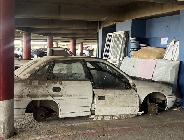 ポンテタワー敷地内で、タイヤもドアも外されて放置された車 警備員が目を光らせるゲート、廃車が放置される駐車場、破れた窓に鉄の回転扉……。インターネット上で「世界最凶都市」とも囁かれる南アフリカ・ヨハネスブルクには、「⼊ったら15秒で死ぬ」と噂される⾼層ビルがある。24 時間体制で厳重警戒される鉄のゲートの内側の取材を試みた。