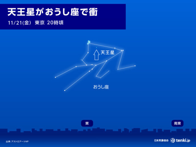 今夜21日、おうし座に位置する天王星が「衝」となり、太陽-地球-天王星が真っすぐに並びます。太平洋側の地域を中心に、ほぼ一晩中、見られるチャンスです。天体観測の際は、寒さ対策を万全にして楽しんでください。