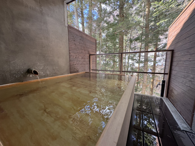 湯船には、正真正銘の四万の源泉が、加水・加温・循環・消毒無しの完全掛け流しで注がれています。泉質は、カルシウム・ナトリウム−硫酸塩泉。無色透明のお湯からは、鮮度の良い甘くきりっとした香りが漂い、豊富なミネラルを感じます。温泉にゆったりつかっていると、なめらかにやさしく包み込んでくれるような浴感。周囲を森に囲まれ、他に誰もいない凛(りん)とした空気の中、時間を忘れて湯あみを堪能することができました。
