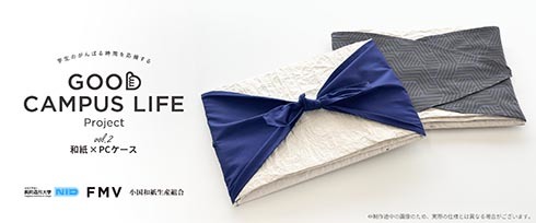 同社が展開する「GOOD CAMPUS LIFE Project」の第二弾プロジェクトで、新潟県長岡市にある長岡造形大学および同市にある小国和紙生産組合と協働し、和紙を用いたノートPCケースを開発。強度と耐久性に優れた「強制紙」を採用、風呂敷のように結んで使える他、結ばずにスナップボタンで留めて使用することも可能だ。